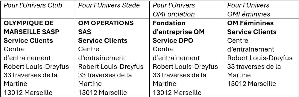 - Protéger les droits de l’OM et notamment dans l’intérêt légitime de l’OM de se protéger contre une mauvaise utilisation ou un abus des Services, de protéger les biens et le Stade ou la sécurité des personnes, intenter des recours qui sont à la disposition de l’OM et limiter ses dommages, respecter les procédures judiciaires ou répondre à toutes exigences licites ;